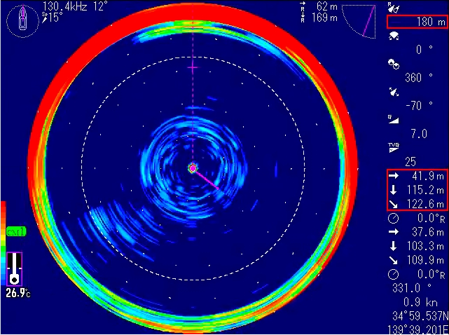 ・Bottom scan mode can display reflected echoes from underwater and seabed in a cross selection image.