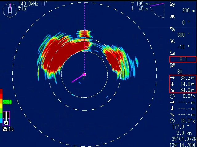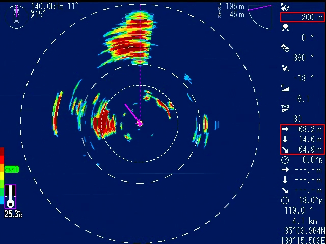 Scanning speed is remarkably increased by adding 15°and 20° in scanning sector angle steps. lt can detect surrounding fish schools quickly.