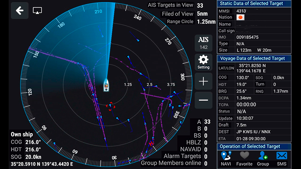 AIS radar screen which is easy to get the AIS information using ring markers / Dashboard to display various data / NAVI and PLOT data management / Tide information, etc., are possible.