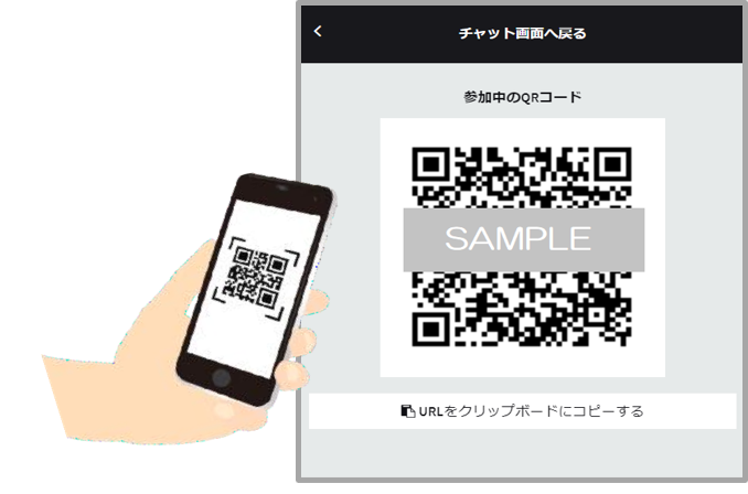 1つのIDでチャットルーム開設(QRコード発行)後、QRコードを読み取り会話参加できます。