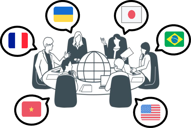- 参加者が多人数と多言語であっても、各自の発言が各自の言語に同時翻訳される。