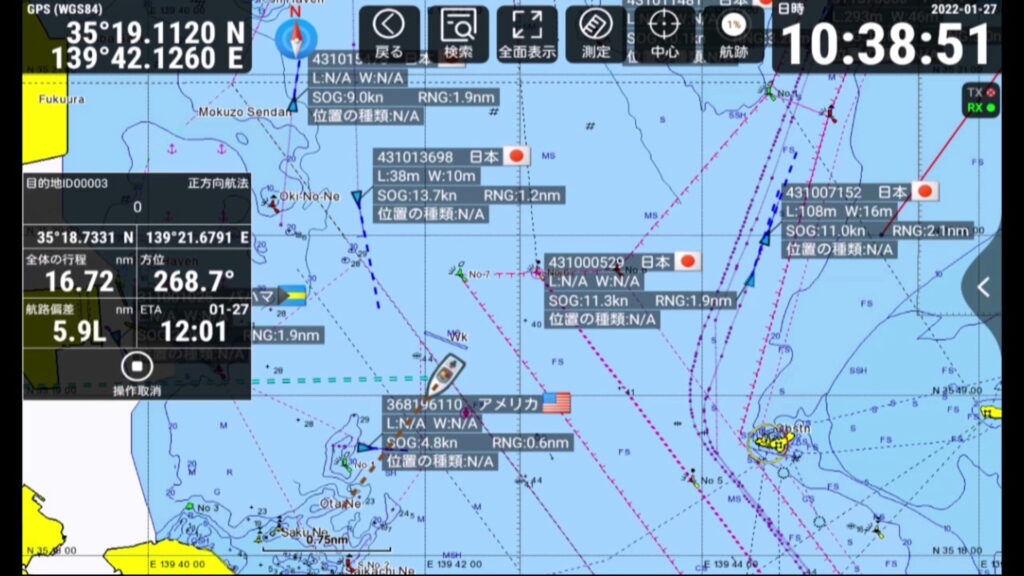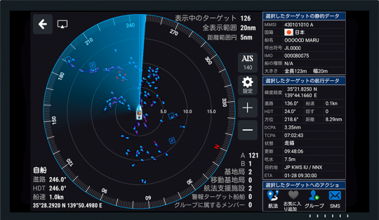 自船を中心とし、自船の周りに可変の半径を設定してリングを表示します。他船との距離・方位が簡単に把握でき、自船を中心とした様々な情報と共に、AISターゲットをリアルタイムで見る事ができます。また選択したターゲット情報が右の情報ボックスで確認できます。
