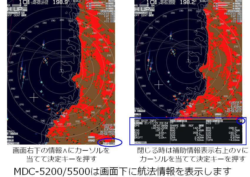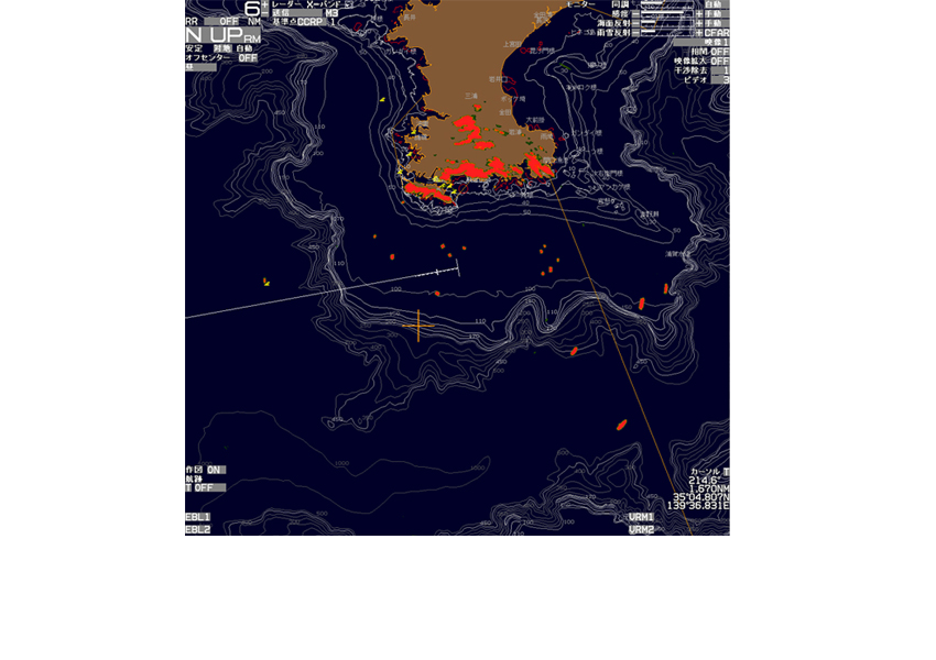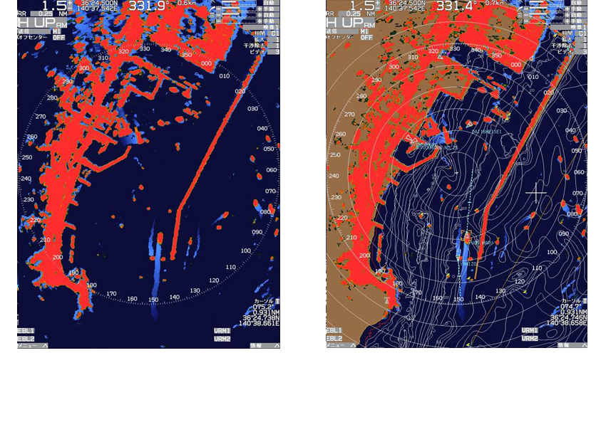レーダー機能に海岸線地図を重ねて表示します。航路・ブイ・危険物標も重ねて表示できるので、より安全な航行に役立ちます。ヘッドアップモードにおいても、船の針路変更に合わせて地図はスムーズに追従します。 また、国内地図にnew pec地図を採用し、等深線情報をより詳細に表示する事が出来ます。 (オプション)