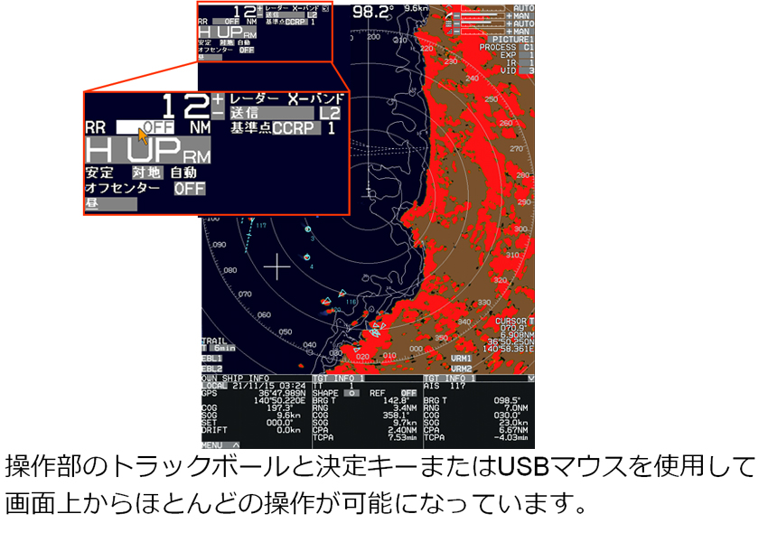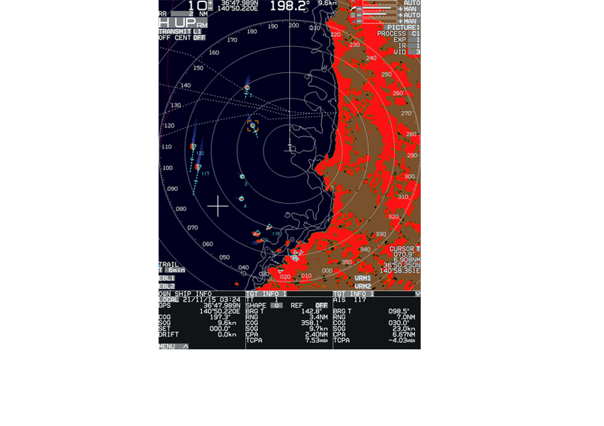 自動追尾機能(ATA)は、最大100ターゲットの追尾が可能です。他船の最新動向をベクトルや数値で瞬時に把握出来ます。自動捕捉範囲を設定することにより、その範囲に入ってきたターゲットを自動的に捕捉します。